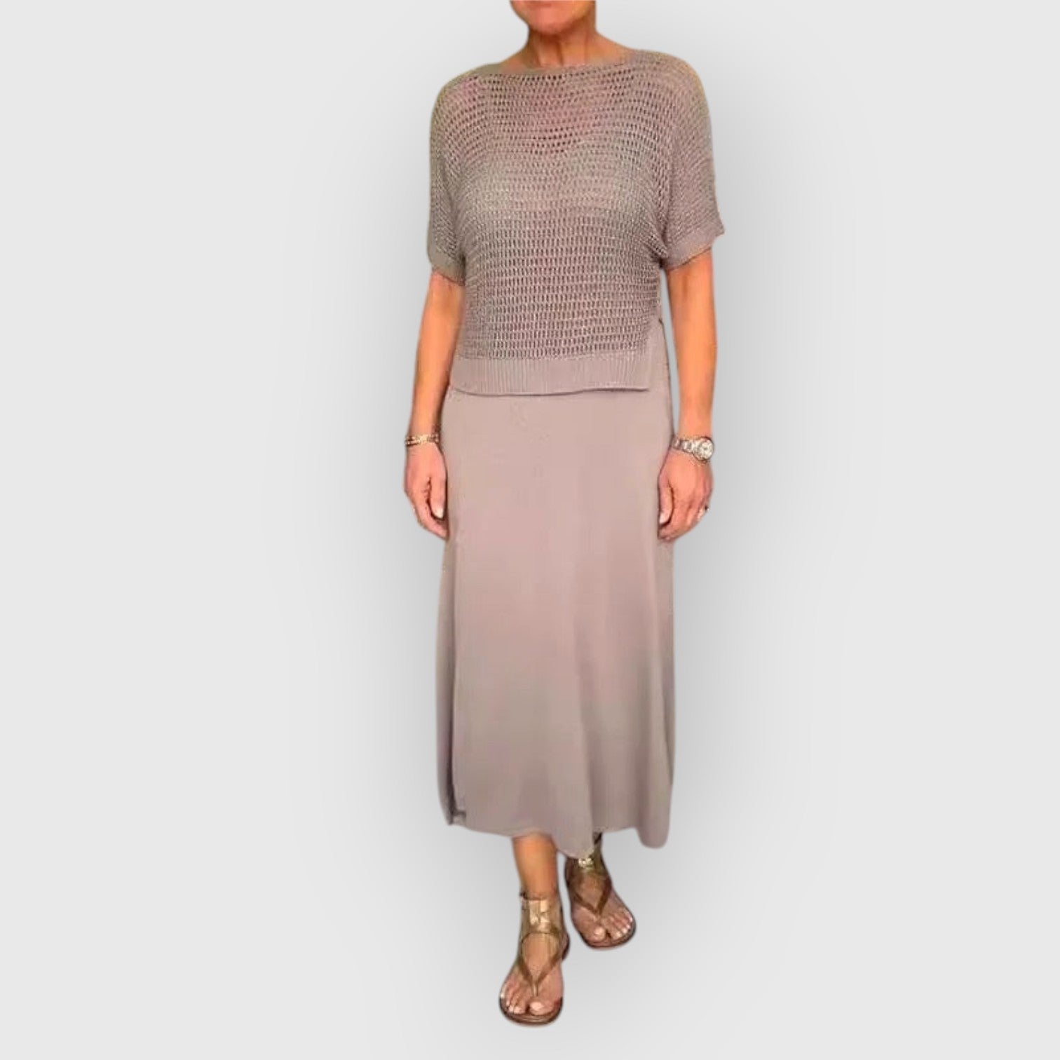 Een frisse, verfijnde en tijdloze look perfect voor de warmste dagen. De outfit in eenvoudige tinten combineert comfort en stijl met een minimalistisch chique accent. Perfect voor wandelingen in de stad of een aperitief buiten. Nu beschikbaar met een speciale korting voor de zomerse uitverkoop!