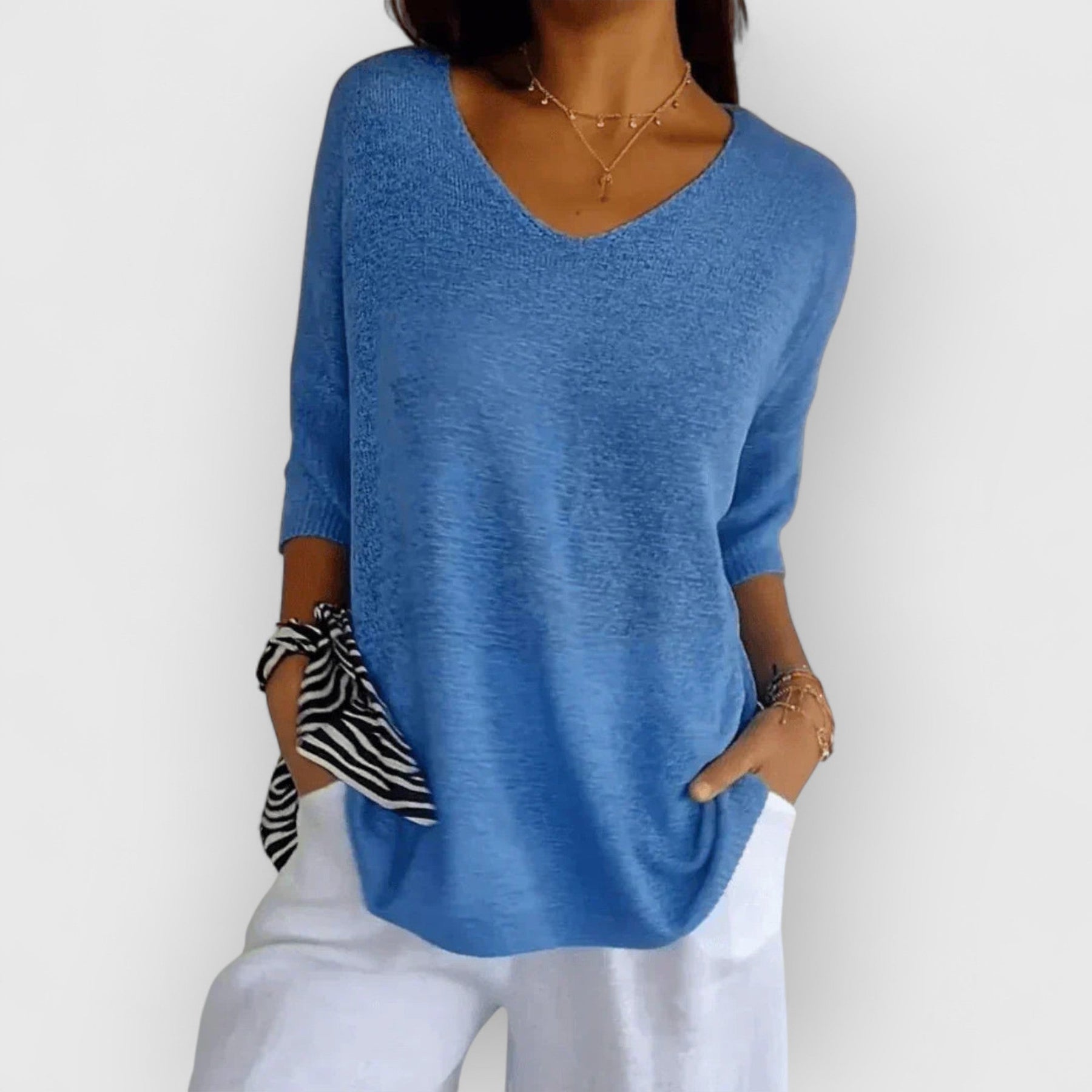 • Tijdloos ontwerp met een klassieke V-hals en driekwart mouwen voor een chique uitstraling.