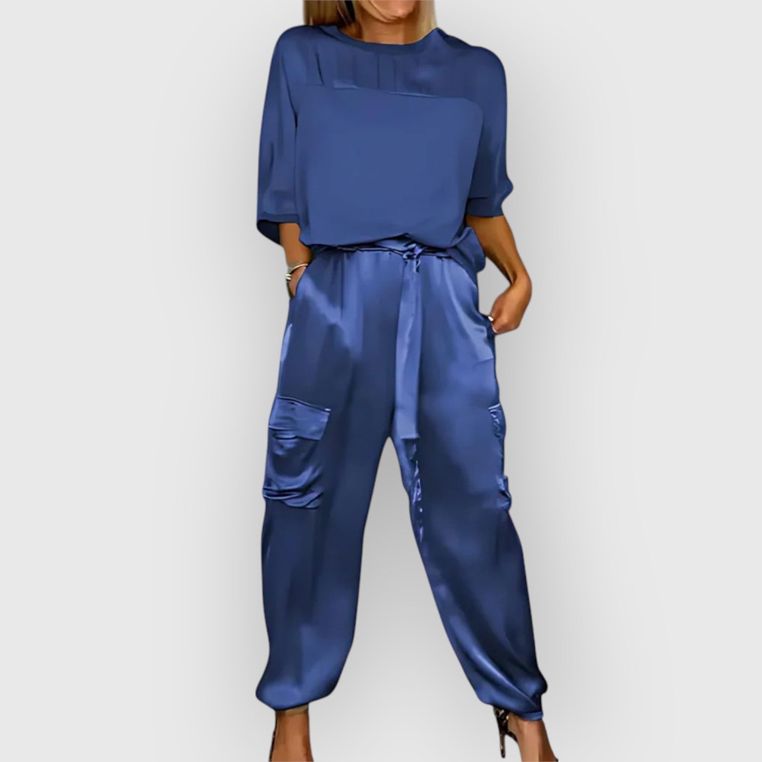 Ontdek de perfecte combinatie van elegantie en comfort met de Evanya™ | Elegante Broek En Blouse Set. Deze tweedelige set, bestaande uit een satijnen blouse en een broek met wijde pijpen, is ideaal voor zowel formele gelegenheden als ontspannen uitjes. Geniet van de veelzijdigheid en stijl die deze set biedt.